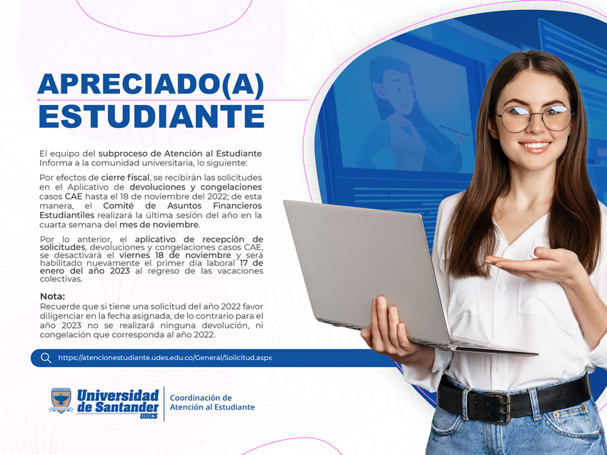 Se infroma a la COmunicad Académica de la fecha en que se desactivará el Aplicativo de Devoluciones y congelaciones Casos CAE, con el fin de que radique sus solicitudes a tiempo y de esta manera la institución dará cumplimiento al cierre fiscal del año 2022.