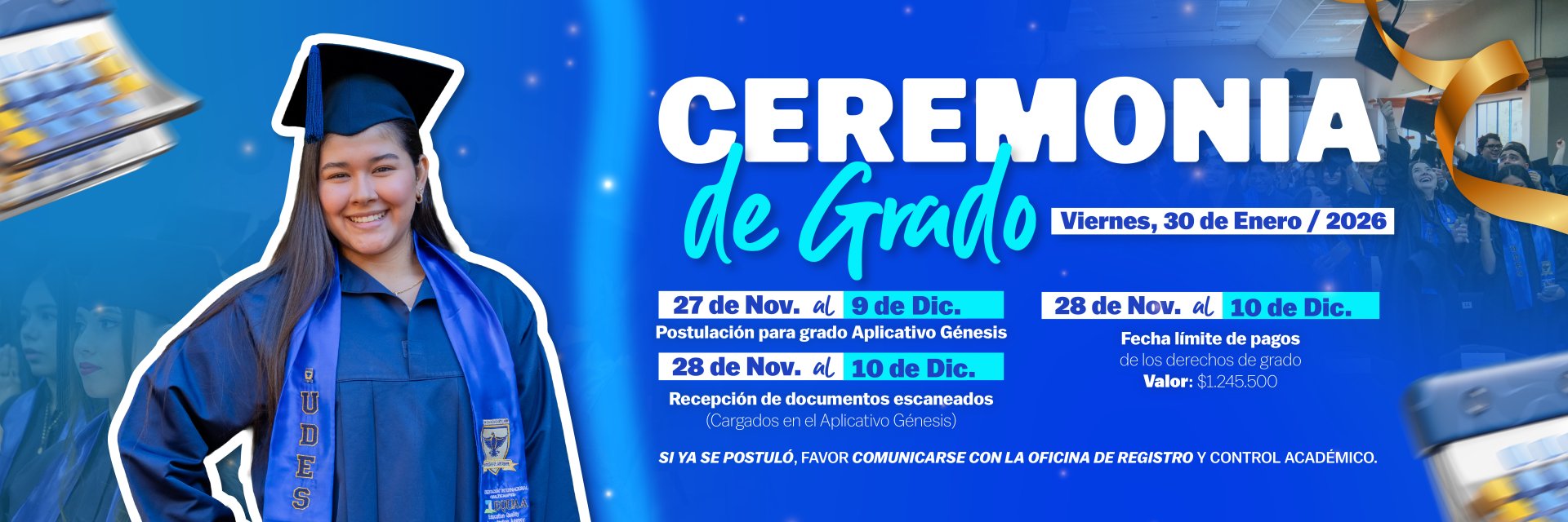 Fecha de postulación a grado desde el 27 de noviembre hasta el 9 de diciembre de 2025, ingresando al Enlace: https://genesis-cuc.udes.edu.co/#/ opción: Solicitud a grado